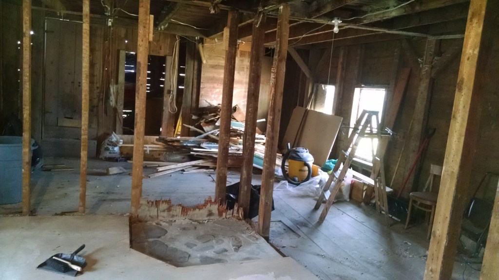 Our first couple of concerts were held in our dining room with half of the audience sitting behind the breakfast bar in the kitchen – definitely less than ideal. We then tried having a concert on our porch, but that also had many challenges. At the time, our family room was about a third the size it is now, with the rest of the space just being old sheds. After a few concerts where people were squeezed into that small area, we started dreaming about a bigger space and in early spring of 2016 we started knocking down walls. Our goal was to have the room completed by August in time for our next concert. Bill and I (mostly Bill) were doing the work by ourselves and by mid-May it was obvious that Bill couldn’t continue to work full-time and get the project completed.