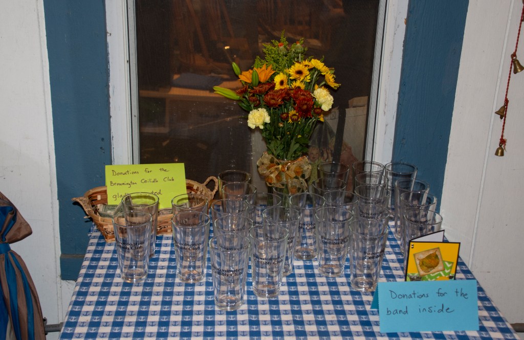 As word spread about our house concert series, more and more musicians began reaching out asking for a place on our schedule, and our audience grew. It was a surprise to us that by 2018 we’d been hosting concerts for 5 years. People started to suggest that we needed to mark the occasion with something special. After lots of discussion, we settled on BCC pint glasses and our daughter-in-law, Liz, went to work designing and ordering them for us. Cantrip was scheduled to perform in August that year and since they were the first group to play for us, it seemed only fitting that we celebrate 5 years during that concert. Everyone who attended received a pint glass and the remaining glasses now sit near the keezer and are used to serve homebrew.
