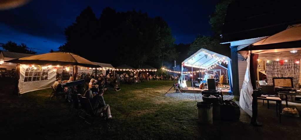 As 2023 approached we began thinking about how we were going to commemorate the 10th anniversary of the BCC (and our 40th wedding anniversary). Someone suggested we have a festival and invite some of the bands who had played at our place over the years. We didn’t know anything about hosting a festival, but once again the amazing BCC community stepped up. People volunteered to help with things we didn’t even know we needed (an emcee, a stage manager, decorations, etc.). We considered many different food options and ultimately decided a potluck would fit perfectly with our motto of “building community through traditional music”.